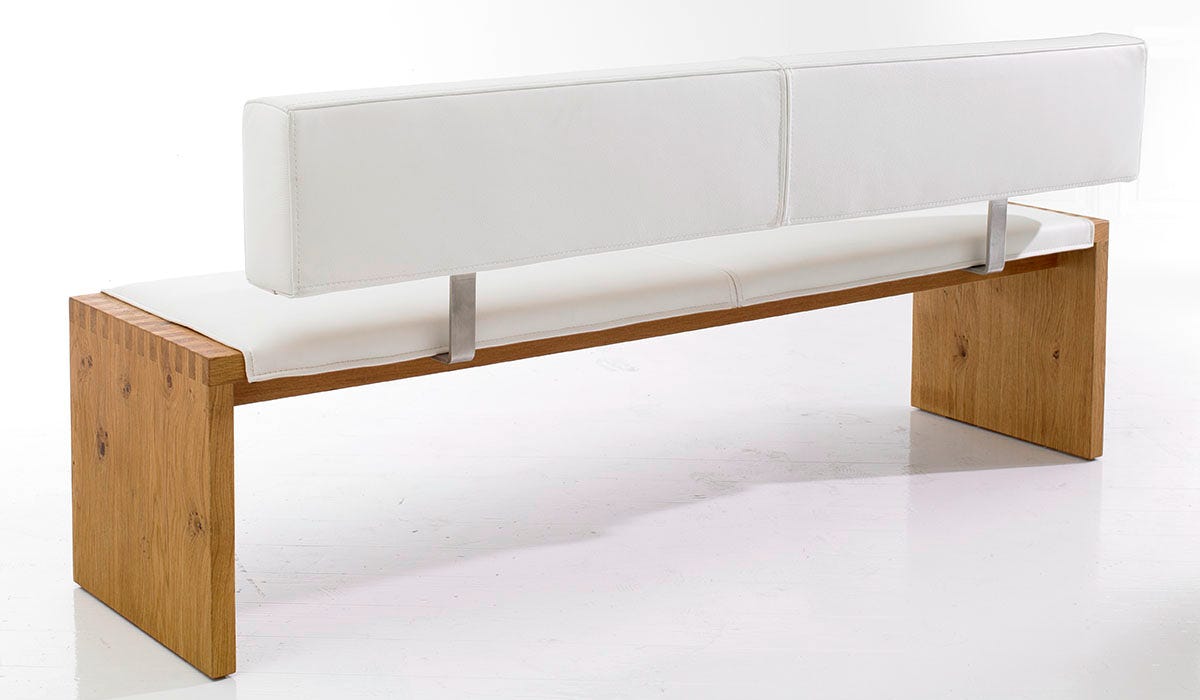 Bank und Hocker SD13, abgebildet in astiger Eiche, geölt, mit weißer Lederpolsterung, Bank 180 cm breit, 60 cm tief, Hocker in den Maßen 60 x 40 cm.