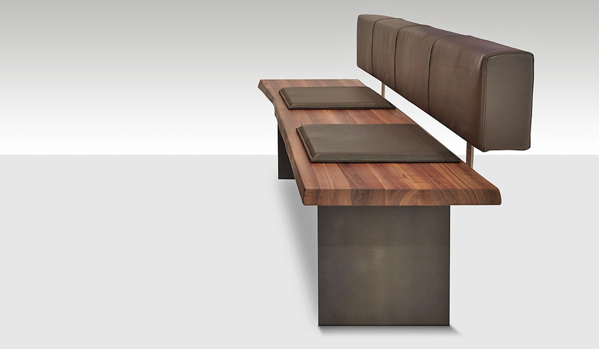 Bank Solid – eine massive Sitzfläche und Wangen in Roh- oder Edelstahl. In allen Schulte Design Hölzern erhältlich.