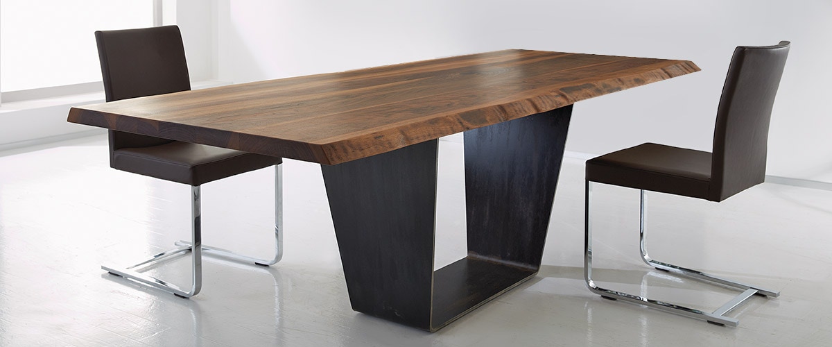 Der Tisch „Solid“ ist solide. Hier aus Kirschholz. und unten aus „black walnut“, Nussbaum aus Nordamerika. Die typischen hellen Streifen werden fachmännisch dazugefügt, um die Eleganz des Materials zu unterstreichen. Die sichtbare Baumkante zeigt die gewachsene Struktur des Holzes.