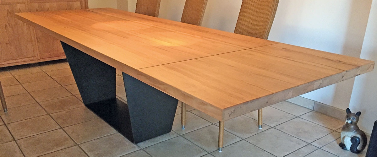Das Untergestell links wurde weiß gepulvert. Kundeneigene Schalenstühle ergänzen sich optimal zu einem wunderbarem Tischensemble für sechs bis acht Personen.