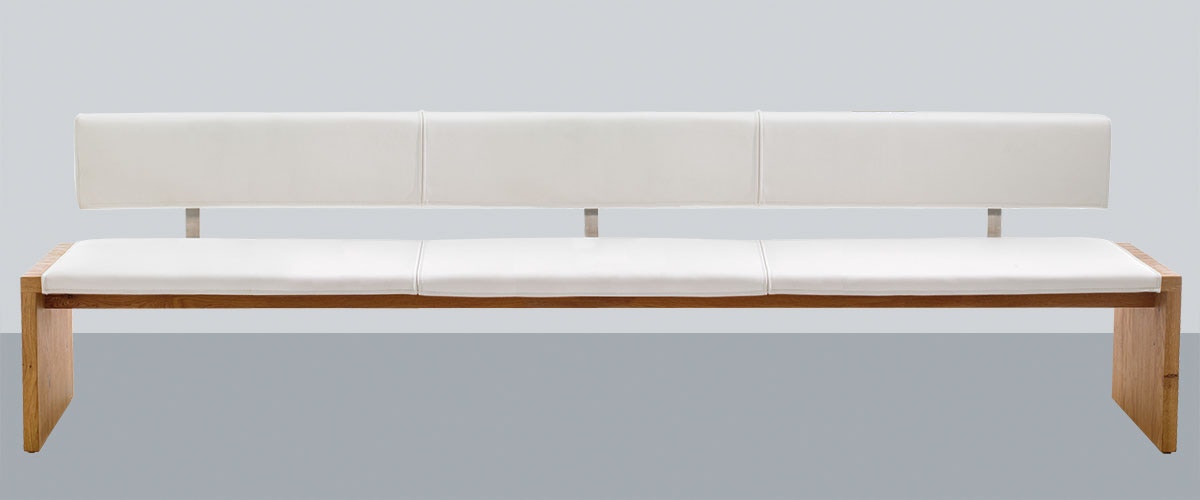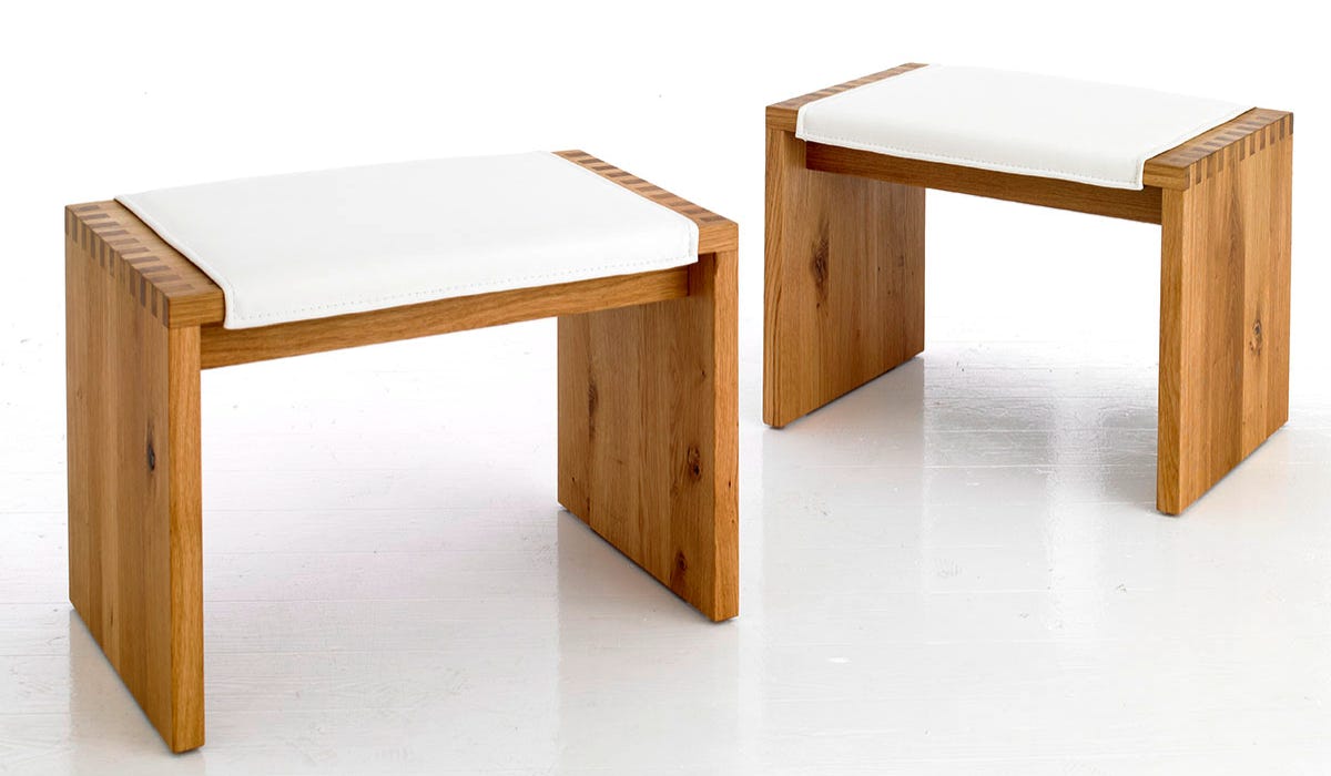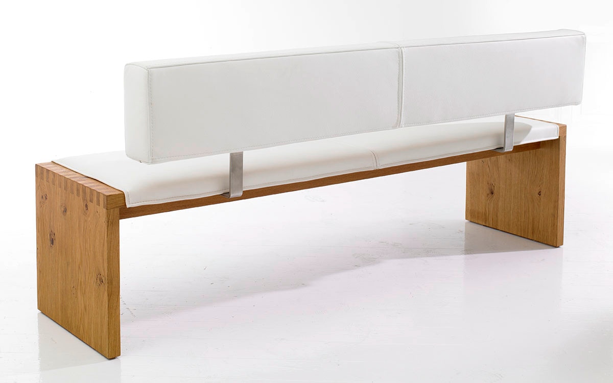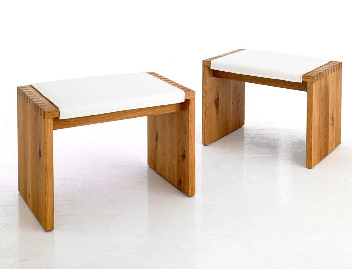 Bank und Hocker SD13, abgebildet in astiger Eiche, geölt, mit weißer Lederpolsterung, Bank 180 cm breit, 60 cm tief, Hocker in den Maßen 60 x 40 cm.