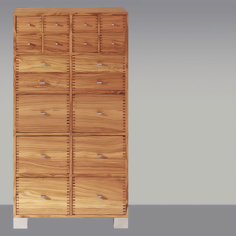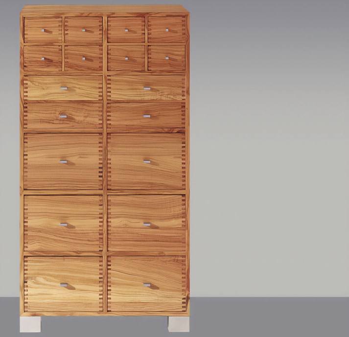 Der alte Apothekenschrank stand hier Pate. Längst wird dieser nicht mehr gebraucht, aber die vielen Schubladen vermitteln Ordnungsinn und Vertrautheit aus einer vergangenen Zeit