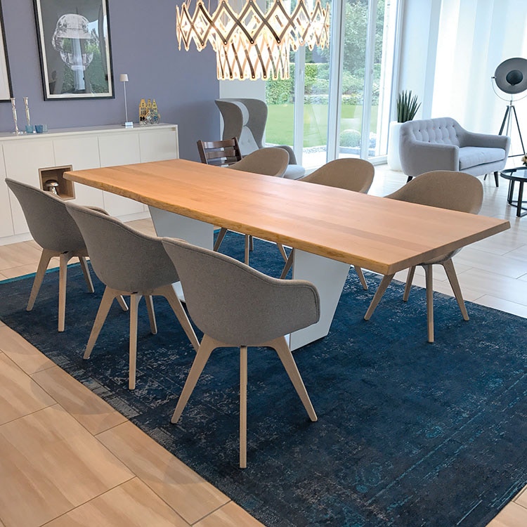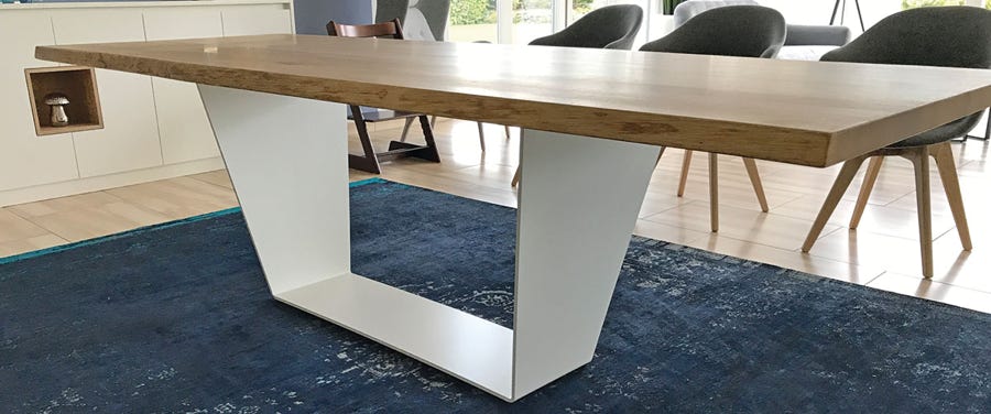Das Untergestell links wurde weiß gepulvert. Kundeneigene Schalenstühle ergänzen sich optimal zu einem wunderbarem Tischensemble für sechs bis acht Personen.