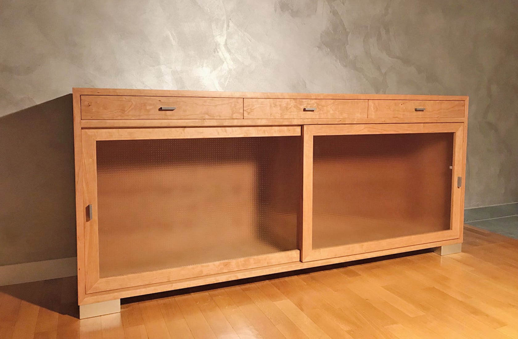 Anrichte OST 2. Türen als Schiebetüren in Massivholz Rahmenbauweise mit Glasflächen.